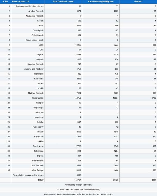 Among other states/UTs where corona cases have surged past 2,000-mark are West Bengal (4,009), Andhra Pradesh (3,171), Bihar (2,983), Karnataka (2,283) and Punjab (2,106).
