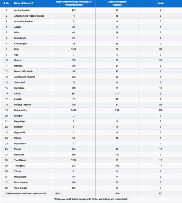 The total number of people confirmed positive for the coronavirus in India has increased to 11,439 while 377 deaths were reported across the country, as per the latest data updated at 8 am today (15 April) by the Health Ministry.