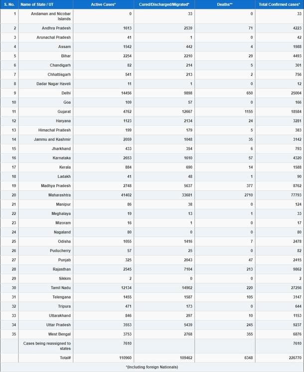 Among other states/UTs where Corona cases have surged past 2,000-mark are West Bengal (6,876), Bihar (4,493), Karnataka (4,320), Andhra Pradesh (4,223), Haryana (3,281, Telangana (3,147), Jammu and Kashmir (3,142), Odisha (2,478), and Punjab (2,415).
