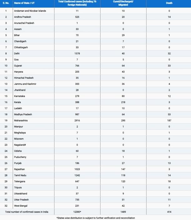 The total number of people confirmed positive for the coronavirus in India has increased to 12,380 while 414 deaths were reported across the country, as per the latest data updated at 8 am today (16 April) by the Health Ministry.