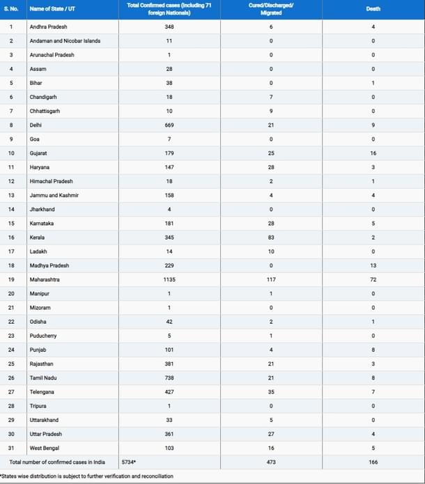 The total number of people confirmed positive for the coronavirus in India has increased to 5,734 while 166 deaths were reported across the country, as per the latest data updated at 8 am today (9 April) by the Health Ministry.