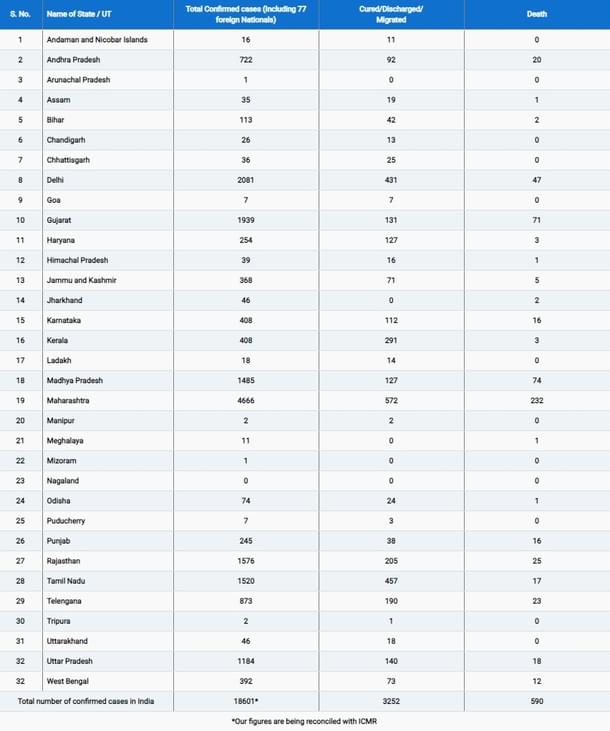 The total number of people confirmed positive for the coronavirus in India has increased to 18,601 while 590 deaths were reported across the country, as per the latest data updated at 8 am today (21 April) by the Health Ministry.