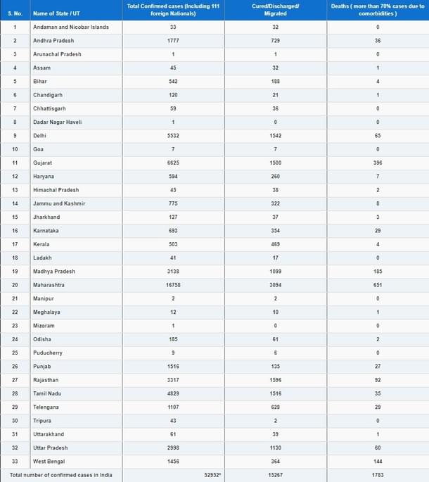The total number of people confirmed positive for the coronavirus in India has increased to 52,952 while 1,783 deaths were reported across the country, as per the latest data updated at 8 am today (7 May) by the Health Ministry.