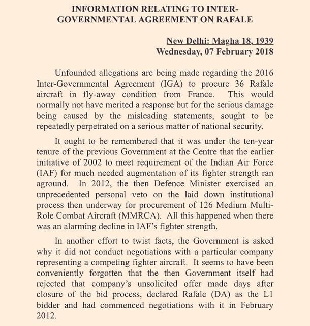 In its statement, the ministry refutes the allegations levelled by the Congress and further clarifies how it has been misleading and giving damaging statements regarding the deal. The statement clarifies how the erstwhile UPA government sat on negotiations even as there was an alarming decline in the strength of fighter jets.