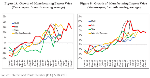 They show that beginning March-April 2017 until September 2017, export growth decelerated while import growth accelerated sharply, a pattern not observed in other Asian emerging economies or the world as a whole. This suggests that the economy experienced a competiveness impact in the demonetisation/GST periods.