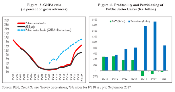 4) The fourth factor exerting a drag on the Indian economy was the twin balance sheet challenge. This has been a drag for some time and its effects have cumulated as the non-performing assets have increased, the financial situation of stressed firms and banks have steadily worsened. During the past three years, profits of the PSBs have plunged into negative territory as provisioning against the bad loans increased substantially (Figures 15 and 16). This, in turn, has impaired banks’ ability to supply credit to industry.