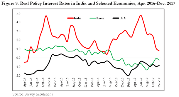 1) First, India’s monetary conditions decoupled from the rest of the world as figure 9 below shows that until the middle of 2016, real policy interest rates were following the global trend downwards. Since then, the downward movement has continued in most other countries, with rates falling on an average by 1 percentage point between July and December 2016 in the US. But in India, for the same period, average real interest rates rose by about 2.5 percentage points. This tightening of monetary conditions contributed to the divergence in economic activity in two ways.