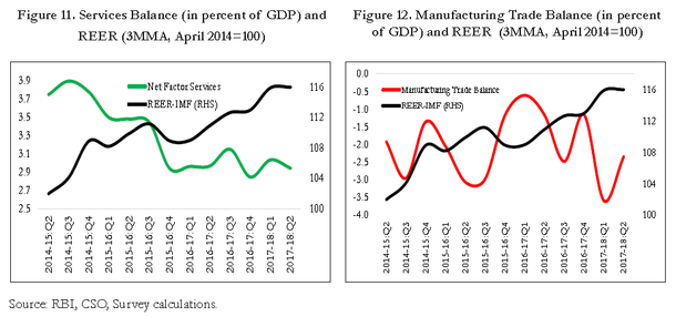 First, it depressed consumption and investment compared to that in other countries. Second, it attracted capital inflows (Figure 10), especially into debt instruments, which caused the rupee to strengthen, dampening both net services exports (Figure 11) and the manufacturing trade balance (Figure 12).