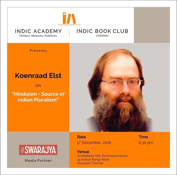 Indic Academy will be hosting a talk by Koenraad Elst on ‘Hinduism - Source of Indian Pluralism’. The event will be held on 5 December 2016 in Sri Siddanta Hall, Chennai.