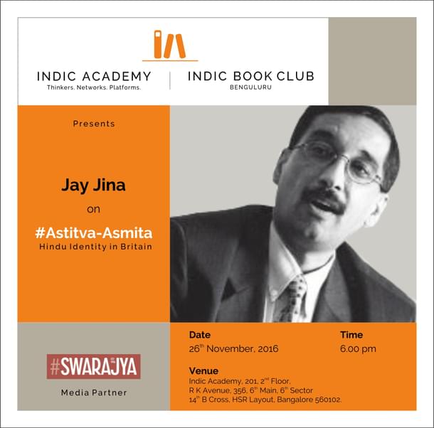The Bengaluru chapter of Indic Book Club will host a talk by Jay Jina on Astitva and Asmita - A perspective on evolving Hindu identity in Britain.