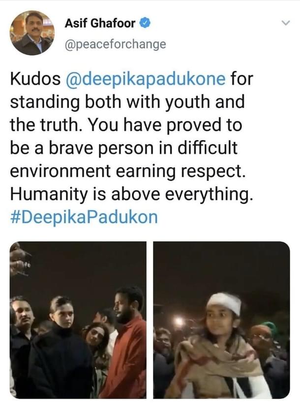 “Kudos Deepika Padukone for standing both with youth and the truth. You have proved to be a brave person in difficult environment earning respect. Humanity is above everything,” the Pakistani Military spokesperson said in a tweet, which he later deleted.