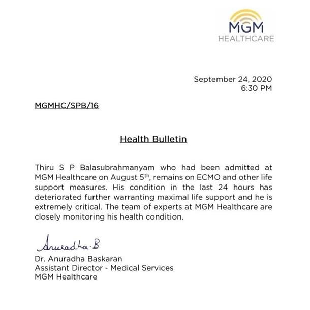 Legendary playback singer S P Balasubrahmanyam has been placed on maximum life support after his health deteriorated further in the last 24 hours. His health now remains extremely critical as per a release by MGM Healthcare in Chennai where he is undergoing treatment.