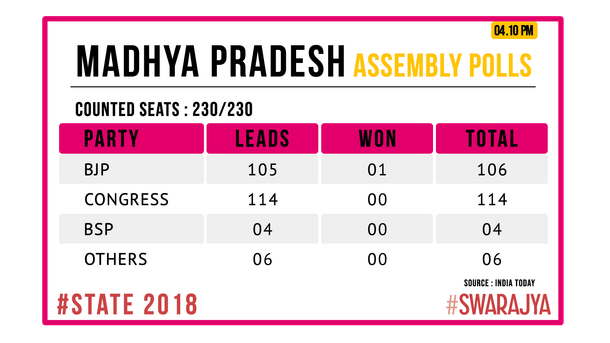 5:00 PM IST: Ambiguity Reigns Supreme In MP: Congress leading towards the halfway mark with BJP not far behind as Swarajya closes its live coverage.