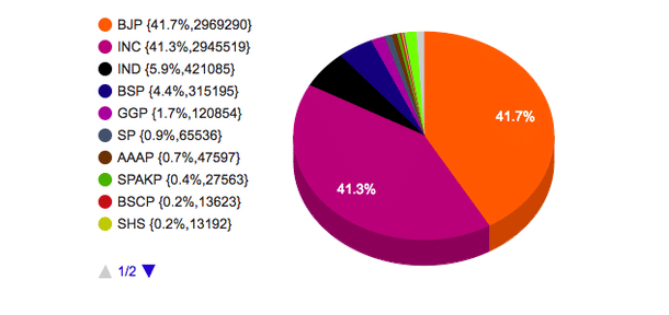 BSP, SP and independents may eventually play kingmaker after the final results are announced, with Mayawati's party holding a lead in four seats, and the Samajwadi party in one seat. Another five seats are currently dominated by votes for independents or smaller political entities. SP has decided to throw in their lot with the Congress while BSP's stance is less clear, with its leaders stating that they had not been contacted by either party's leaders yet, for their support.