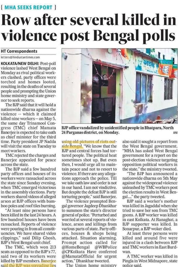 As per reports, at least 14 ‘post-poll violence killings’ have allegedly occurred in the state, with the BJP claiming nine of its cadres have been killed. The ruling Trinamool Congress (TMC) has also claimed three of its workers have been killed.