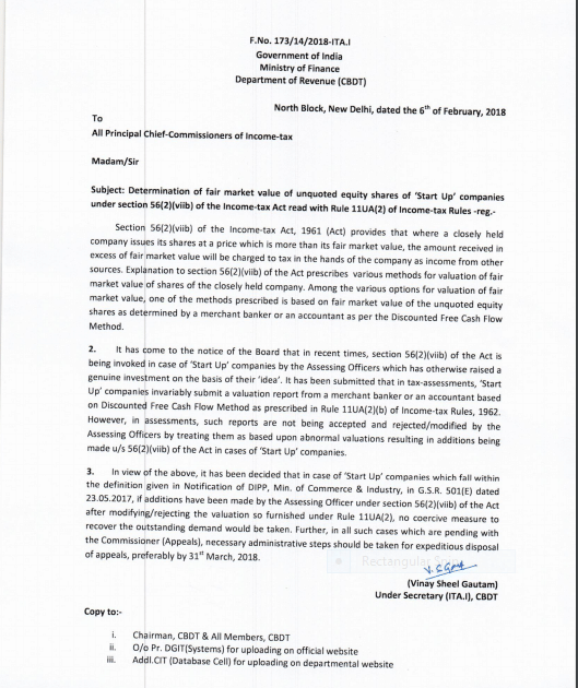The Revenue Department directed the officials not to initiate any “coercive measure to recover the outstanding demand” in cases where additional income accrued on account of high valuations if the startups fall within the definition of the DIPP.