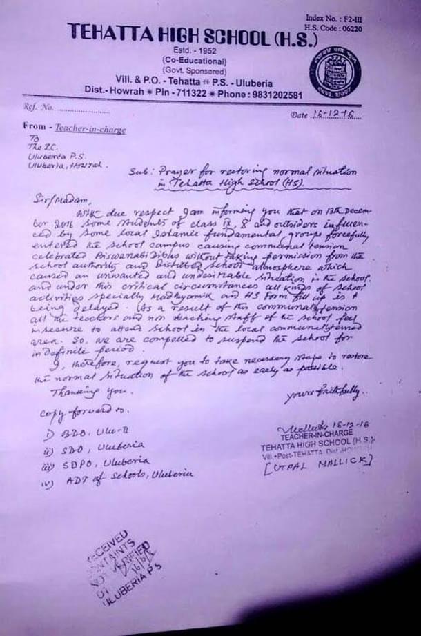 Muslim students in Uluberia’s Tehatta High School, who the school authorities say were influenced by local Islamic leaders, said they would forcibly conduct celebrations of Nabi Diwas in the School on December 13 after Hindus in the town were granted permission for Saraswati Puja celebrations on its premises. Following initial tensions, which saw sloganeering and vandalism, the school authorities wrote two letters to the police - on 16 December and 27 January - warning of the impending danger.