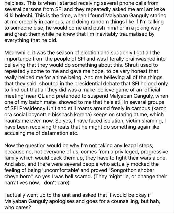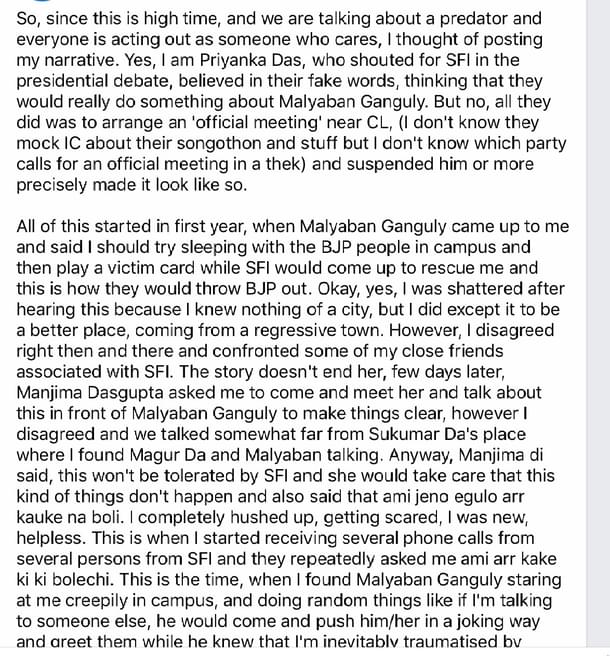 The post by the student Priyanka Das says, “All of this started in first year, when Malyaban Ganguly came up to me and said I should try sleeping with the BJP people in campus and then play a victim card while SFI would come up to rescue me and this is how they would throw BJP out. Okay, yes, I was shattered after hearing this because I knew nothing of a city, but I did except it to be a better place, coming from a regressive town. However, I disagreed right then and there and confronted some of my close friends associated with SFI (sic).”