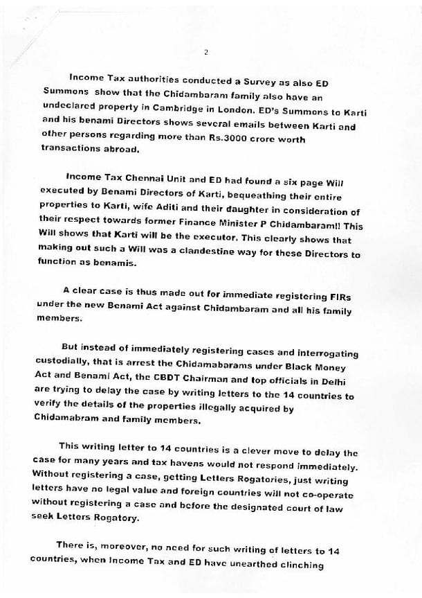 Swamy also put on record that a Will was found during the probe that would bequeath the entire property belonging to various directors of Karti’s firms to him, his wife anf daughter.