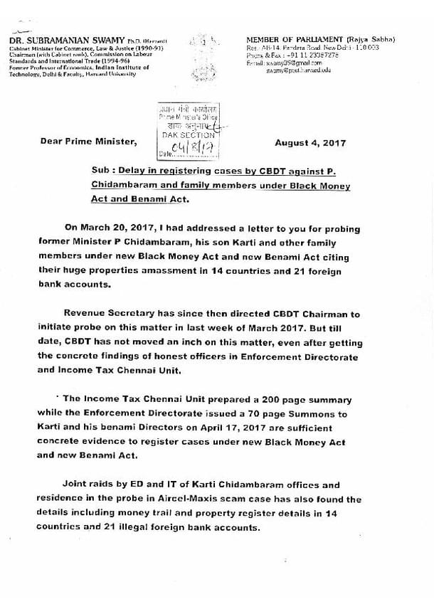 In a letter written to Prime Minister Narendra Modi on 4 August, Member of Rajya Sabha and Bharatiya Janata Party (BJP) leader Subramanian Swamy has accused officials of the Central Board of Direct Taxes (CBDT) as well as those from the Finance Ministry of trying to ‘save’ former union minister P Chidambaram and his son Karti Chidambaram.