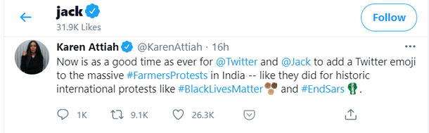 Jack Dorsey has also liked another tweet from the same Twitter user who has called upon twitter to add an emoji to the hashtag "Farmer Protests" like the one it did for Black Lives Matters and Nigeria's End Sars protes.