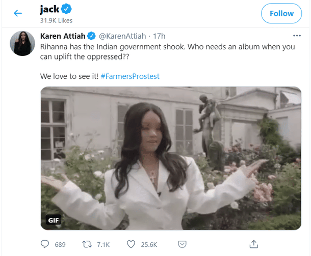 The tweet shared by a Washington Post columnist and journalist Karen Attiah claims that Rihanna has been "uplifting the oppressed" by speaking on the farmer protests.