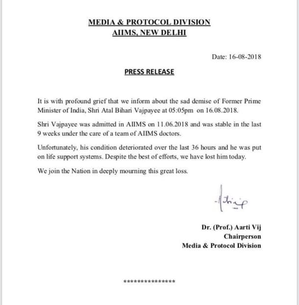 Vajpayee passed away at 5:05 PM today (16 August) following a prolonged illness. He was admitted at the All India Institute of Medical Sciences (AIIMS) in June, and was said to be stable for about nine weeks. His health unfortunately deteriorated in the last 36 hours and had to be placed on life support system.