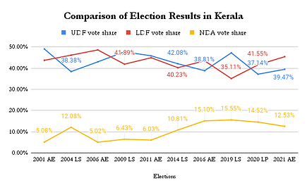 Both UDF and LDF has enjoyed an extremely close vote share in the state which has now been disrupted by the BJP, as you can see here:
