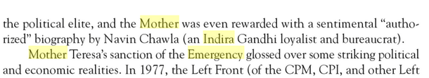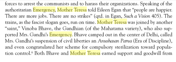 Mother Teresa was another supporter of Emergency. She was of the view that people were happier under the Emergency because there were more jobs and less strikes. It was no coincidence that her close lieutenant, Navin Chawla, was at the forefront of unleashing brutality during the Emergency years. His role in running prison torture cells was documented by the Shah Commisison (all copies of which were burned down by Indira Gandhi’s cronies in ‘babudom’). Chawla was suitably rewarded by the dynasty later for his Emergency era services – he was elevated as chief election commissioner. He also went on to write a hagiography of Mother Teresa.
