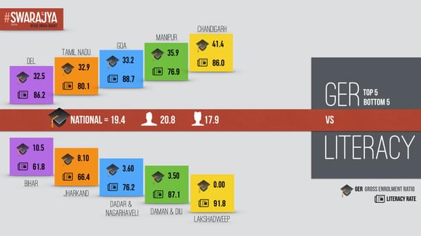 Given the definitions of the two terms, it is obvious that the relationship between GER and literacy rate, with respect to India, is not ideal. The tables above show that in several states, though quite a lot of people are literate, they do not climb up the education ladder. Kerala, the state with the highest literacy-rate, stands 16th with a higher education GER of 21.9. Goa is the only Indian state which remains in the top five on both the scales while Bihar and Jharkhand are among the bottom on both. Chandigarh, which tops with respect to GER, stands 10th when it comes to literacy rate.
