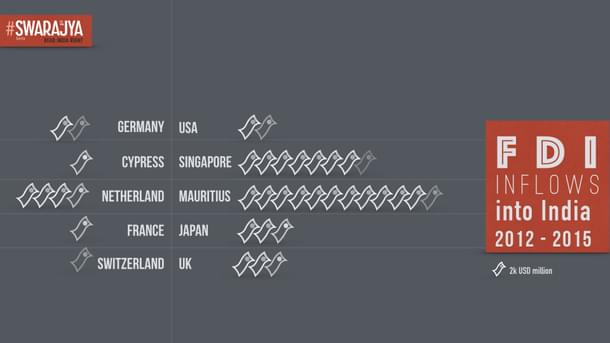 The graph below shows the top sources of Foreign Direct Investments (FDI) inflows into India from fiscal year 2012 to 2015.