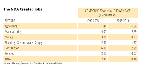 In spite of these various setbacks, the Indian economy created jobs during the NDA regime. Data from the now-defunct Planning Commission tells the story. The data, available only up to 2009-10, is presented in the table below. An annual growth rate of 2.4 per cent in jobs failed to ensure re-election for the NDA in 2004. A miserly 0.1 per cent growth rate in employment— based on job creation only in the construction sector—got the UPA re-elected in 2009.