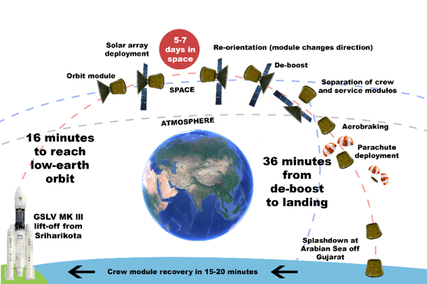 Since the announcement, ISRO has given out some information about its man-in-space plan, which is still evolving. The agency aims to put up to three Indians in space for five to seven days through a 16-minute flight across the Earth’s atmosphere into a 400 kilometre-high low-Earth orbit (LEO) and bring them back with a 36-minute glide and a splashdown in the Arabian Sea off the coast of Gujarat.