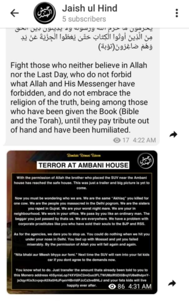 However, the same evening, another letter posted by a group claiming to be the ‘real’ Jaish Ul Hind said it had not posted the first message and that it had nothing to do with the car found near Ambani’s house.