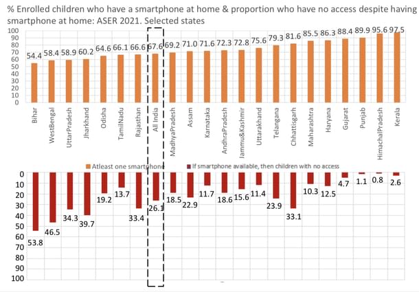 Another interesting finding is that while the availability of smartphones in households surveyed has significantly increased from 36.5 per cent in 2018 to 67.6 per cent in 2021, there is inequity as more children in private schools have a smartphone at home as opposed to government school going children — 79 Per cent and 63.7 per cent respectively.