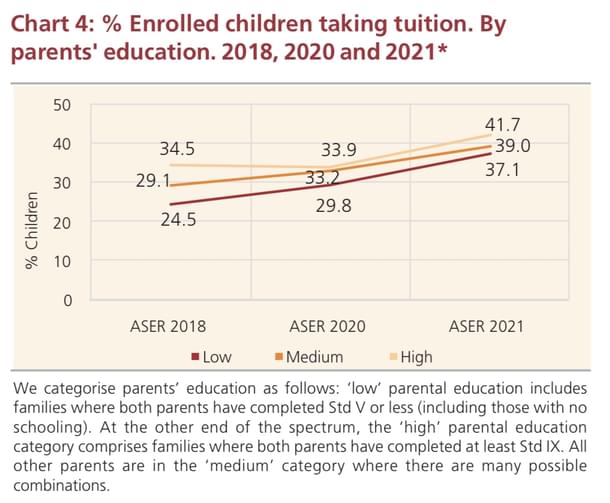 “The largest increases in the proportion of children taking tuition are seen among children from the most disadvantaged households. Taking parental education as a proxy for economic status, between 2018 and 2021, the proportion of children with parents in the 'low' education category who are taking tuition increased by 12.6 percentage points, as opposed to a 7.2 percentage point increase among children with parents in the 'high' education category,” the survey notes.