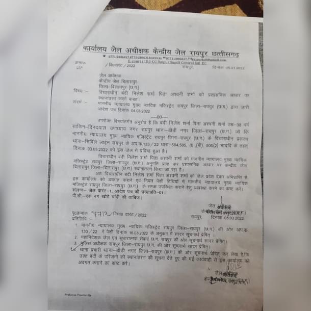 Below is the order issued on 4 March by Raipur district magistrate. The order says that Sharma was sent to Raipur jail on 3 March and had been ordered to be shifted to Bilaspur jail.