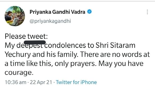 In much embarrassment for the Congress party, its general secretary Priyanka Gandhi made repeated mistakes in her Twitter posts condoling the demise of Sitaram Yechury's son.