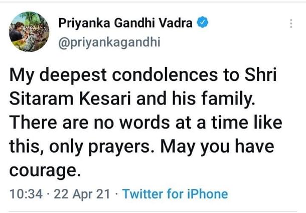 After users trolled her for the mistake, Gandhi deleted this post too. Finally, she tweeted out the correct post, which continues to show on her timeline. It says, “My deepest condolences to Shri Sitaram Yechury and his family. There are no words at a time like this, only prayers. May you have courage.”