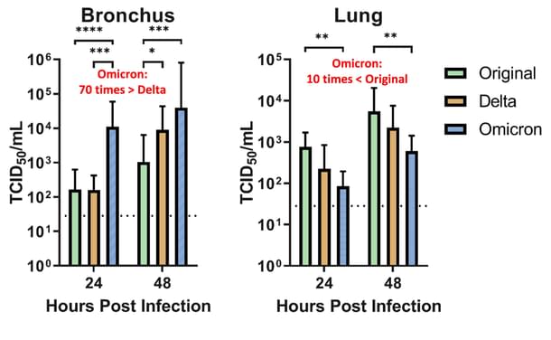 The research team led by Dr Michael Chan Chi-wai, Associate Professor, School of Public Health, HKUMed found that Omicron infects and multiplies 70 times faster than the Delta variant and original Wuhan virus in human bronchus (which explains why Omicron spreads so fast) but infection in the lung is significantly lower than the original SARS-CoV-2 (which explains lower disease severity).