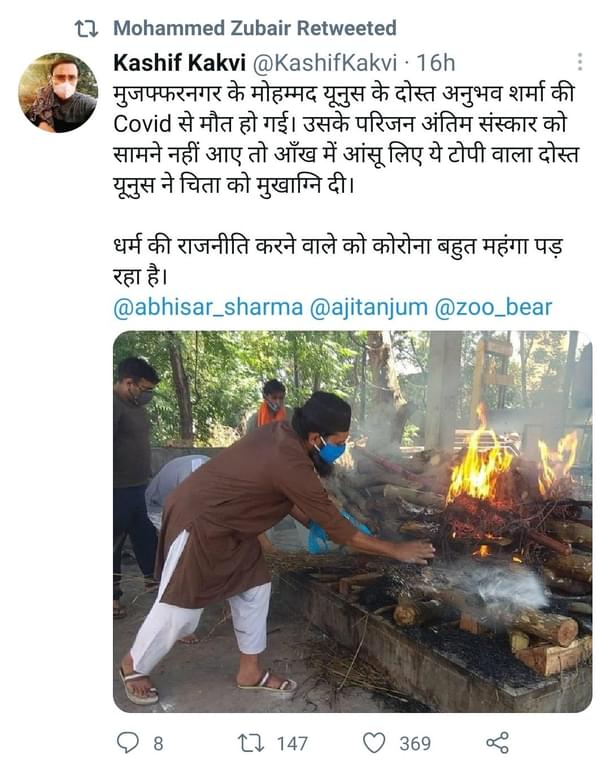 On Twitter, a post by Kashif Kakvi, who has described himself as a journalist with website Newsclick.in in his bio, says that Anubhav’s family did not come forward to perform his last rites and it was for this reason that skull cap-wearing Yunus lit the pyre.