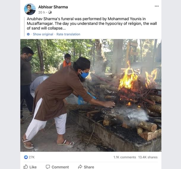 The Amar Ujala report that Sharma referred to was published on the second page of its Meerut edition on 27 April. The report, which has no byline, shows a picture of Yunus near the pyre with the headline: “Muslim friend performs last rites.” The report says that Anubhav died of coronavirus. The report carried no quotes, not even of an eyewitness.