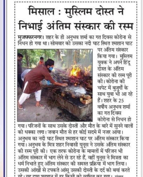 The latest such story to emerge in the current coronavirus crisis is that of one Mohammed Yunus performing last rites of his friend Anubhav Sharma from Muzaffarnagar district of Uttar Pradesh. A picture of Yunus near the funeral pyre of Anubhav has been widely shared on social media.