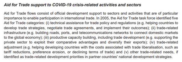 Page 31 shows the five categories in which the Aid for Trade data is collected and counted as specific assistance for trade. Snapshot below.