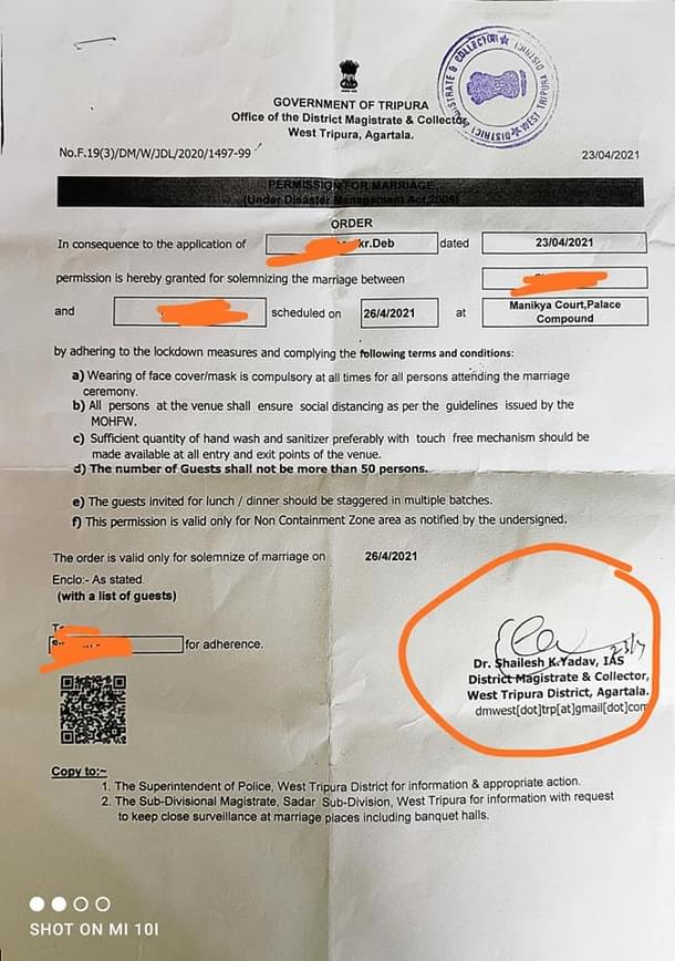 "As per Hindu religious timings, the auspicious time for marriage (logno) was 11.30 pm. Which we already mentioned in our documents submitted at DM office with the wedding card attached (pic 1). As a result of which Dr. Shailesh kr. Yadav ji, IAS, granted us permission to conduct the ceremony (pic 2)", the brother writes.