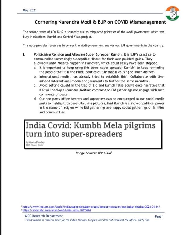 The document specifically instructs Congress workers stating, “Non-party office bearers and supporters can be encouraged to use social media posts to highlight, by carefully using pictures, that Kumbh is a show of political power in the name of religion while Eid gatherings are happy social gatherings of families and communities.“