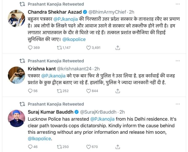 On 18 August, Kanojia was reportedly arrested by UP police. From his own Twitter account, Kanojia retweeted posts that said that he had indeed arrested: