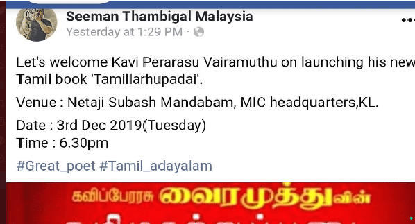 The Tamil lyricist will be launching his new book Tamizhatrupadai in Kuala Lumpur at the Malaysian Indian Congress (MIC) venue on 3 December.