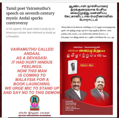 Vairamuthu has already been caught in a couple of controversies in India. First, he made an objectionable speech against Andal Naachiyar, the only female among the 12 Alwar saints of South India, in January last year.