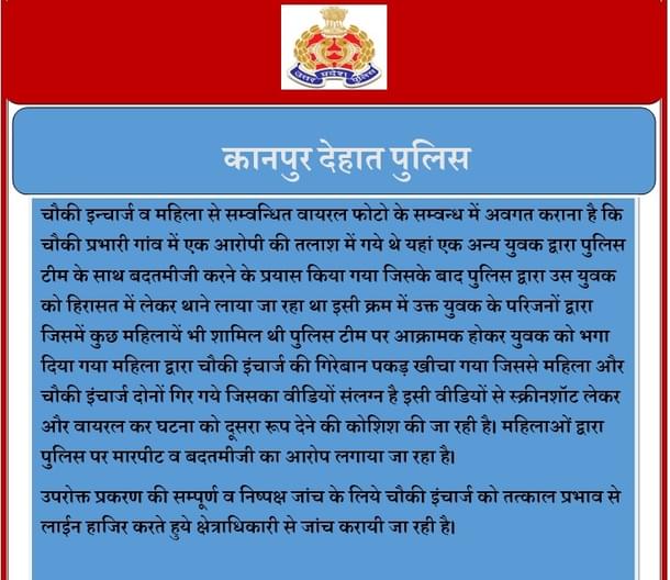 A statement was also released by the Kanpur Dehat police, where it was informed, “The Station-in-charge went to the village to capture an accused in a case. At that time, another man misbehaved with the police official, thereby leading to his arrest. Meanwhile, the relatives of the man including several women began to intervene and resist arrest. One of the women held the Station-in-charge by his collar and pulled him to the ground.”